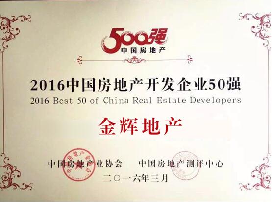 3月22日,在中国房地产业协会和中国房地产测评中心联合举办的“2016中国房地产500强测评成果发布会暨500强峰会”上,金辉凭借优异的销售去化能力和良好的综合实力,正式跃升中国房地产42强!
